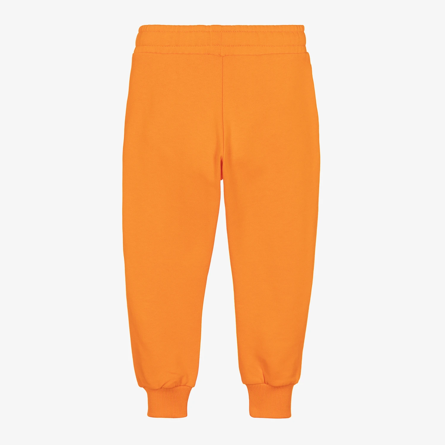 Orange joggers for boys from luxury Italian designer Moschino Kid-Teen, with an iridescent logo print on the front. Comfortable and casual, they have an internal drawstring waist for an adjustable fit, and useful concealed side pockets.