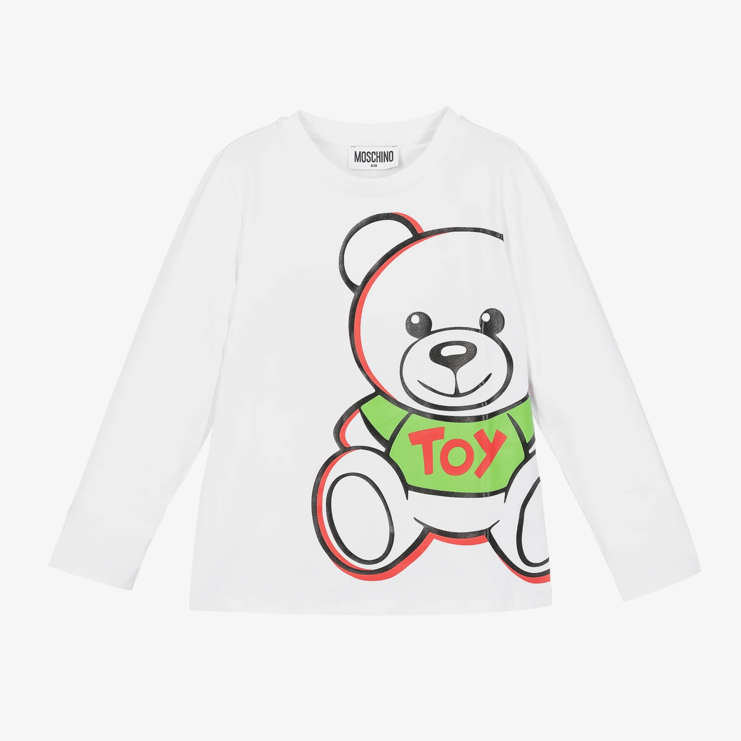 Long-sleeved white top for boys from luxury Italian designer, Moschino Kid-Teen, with an oversized Teddy Bear logo print in red, black and green. An ideal layering piece, this useful wardrobe essential is made in comfortable cotton jersey with a casual ribbed crew neck. To complete the look, there is a bold red and black logo above the back hem.