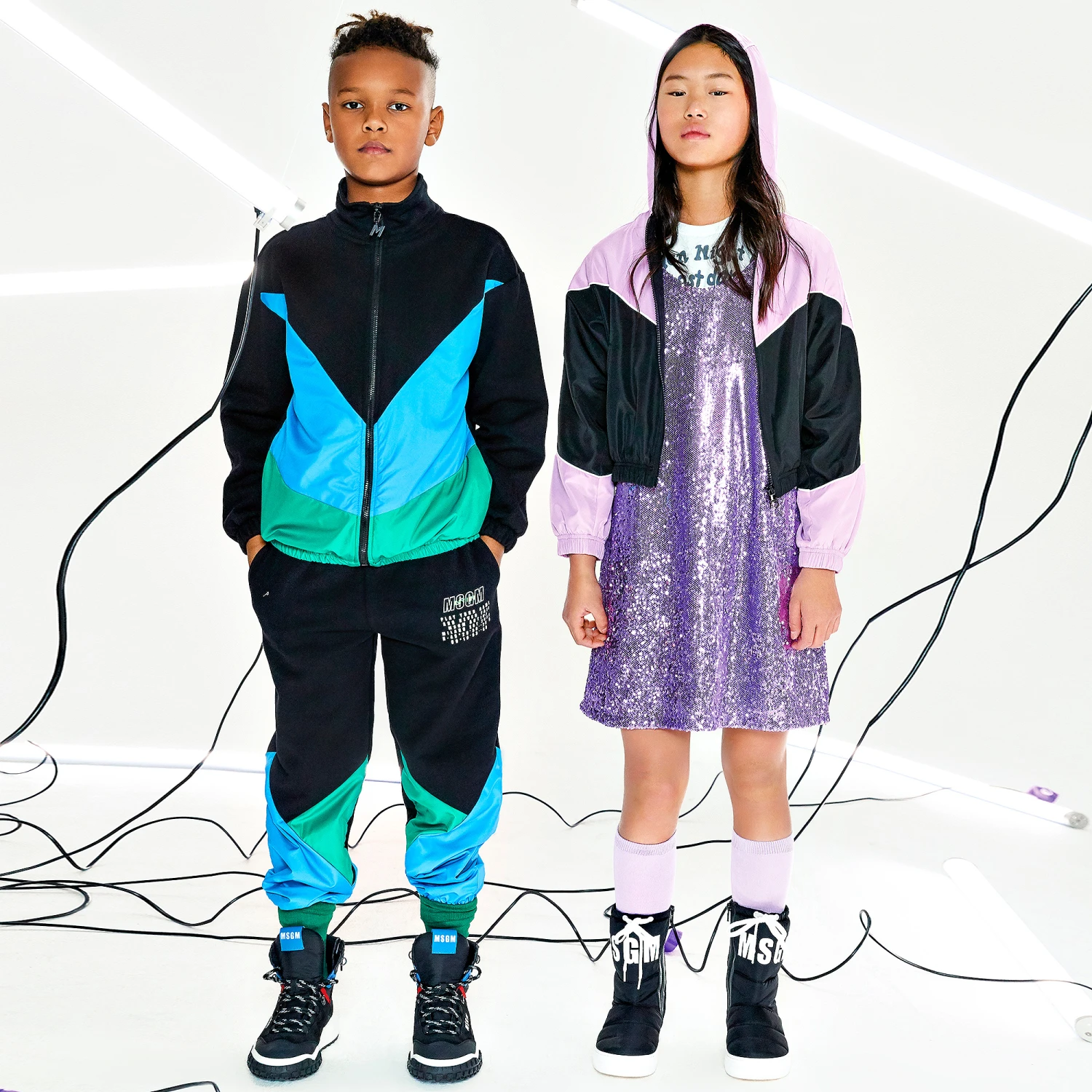 Stylish black joggers for boys by Italian brand MSGM, with silky colourblock patches of green and blue. Made in comfortable cotton sweatshirt jersey with a fleecy feel inside, they have an Active logo printed on the front in white and green. There are concealed side pockets and a single pocket on the back.
