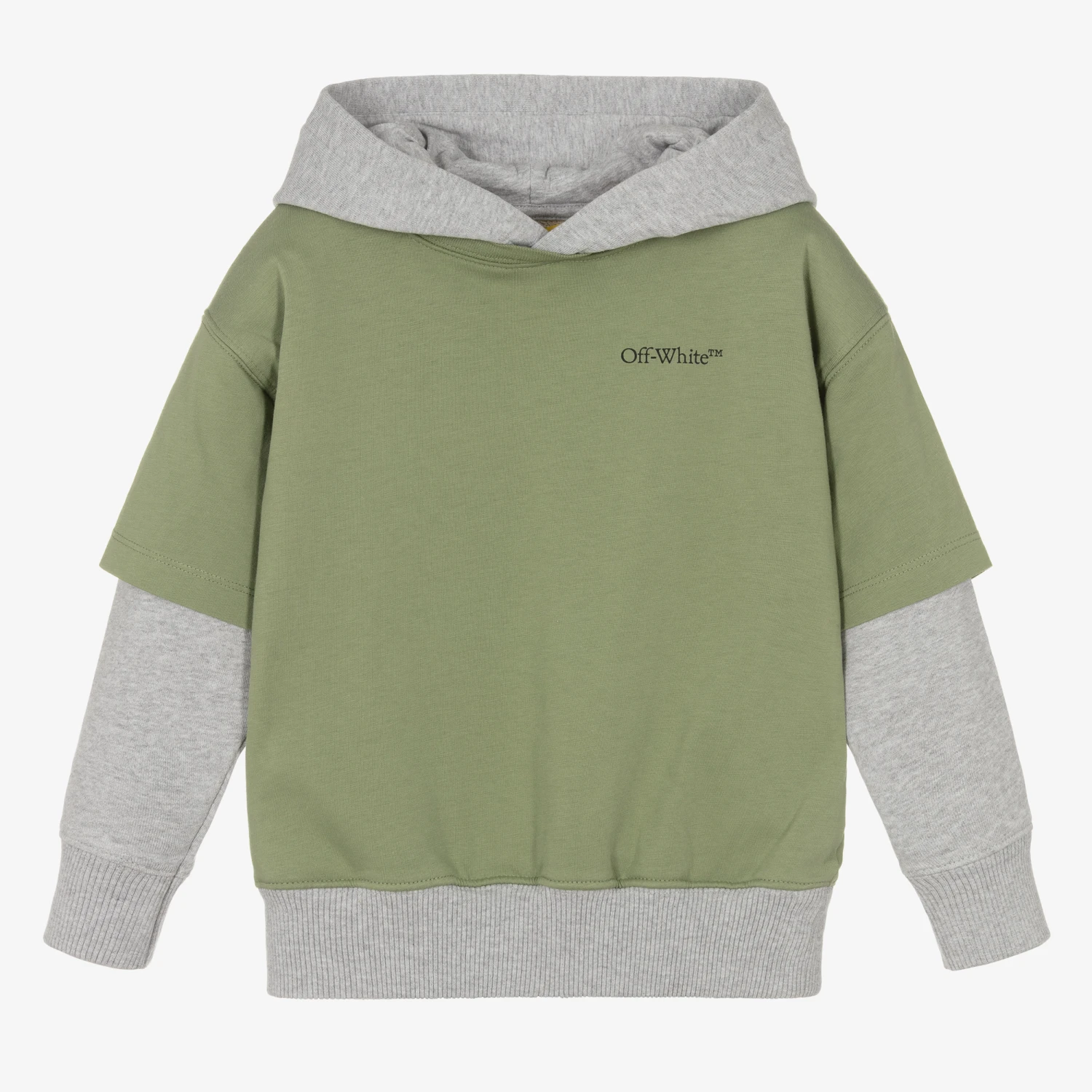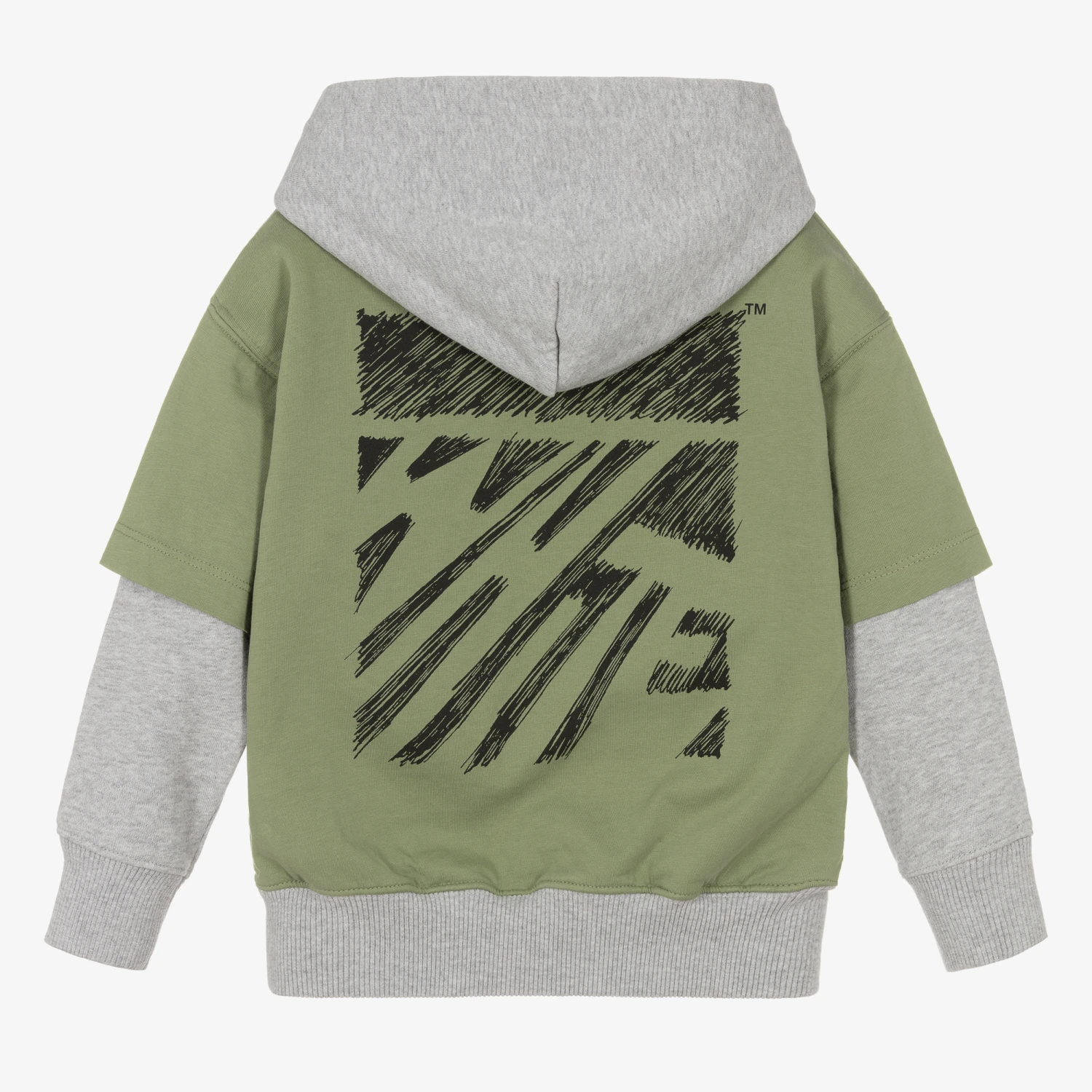 Boys can channel skater style in this muted green and grey marl cotton hoodie by luxury streetwear brand Off-White, made in super-soft and mid-weight jersey. Designed to appear as two pieces, this double-layer-effect top has an attached green ‘T-shirt,’ complete with a black logo graphic on the front. On the back is the designer’s name, detailed within the black abstract scribble artwork. This item contains organic cotton yarn.
