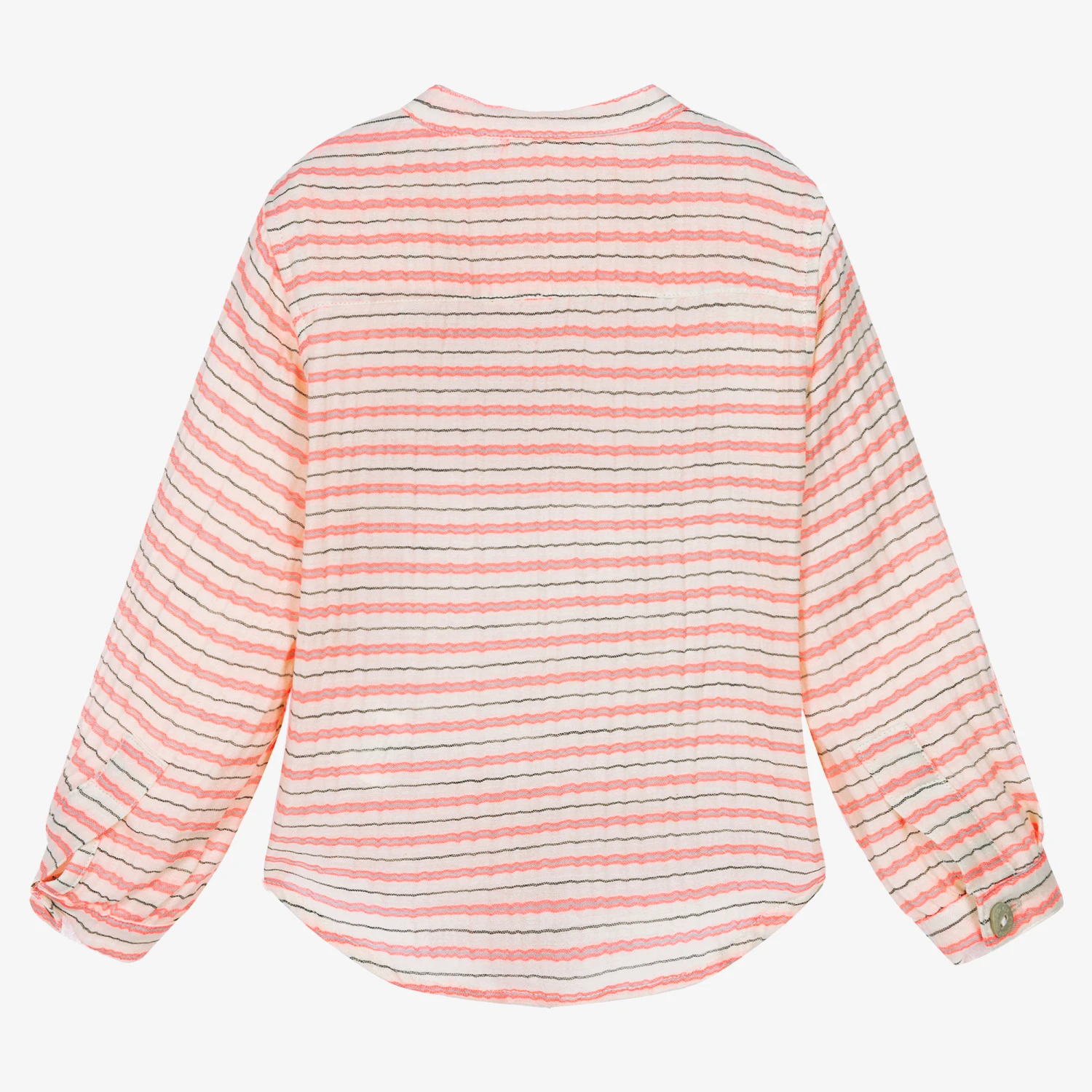 Ivory with a fun pink and grey stripe, this collarless shirt for boys is by Pan Con Chocolate. Woven in lightweight cotton, it is cool and comfortable to wear. There is a small chest pocket, with classic mother-of-pearl button fastenings that are logo branded for a subtle designer touch.