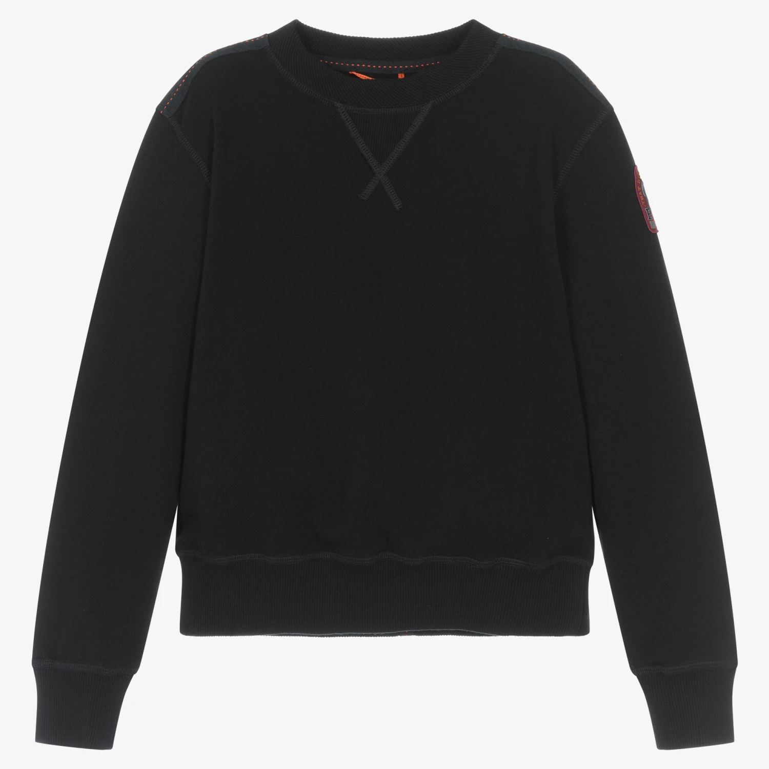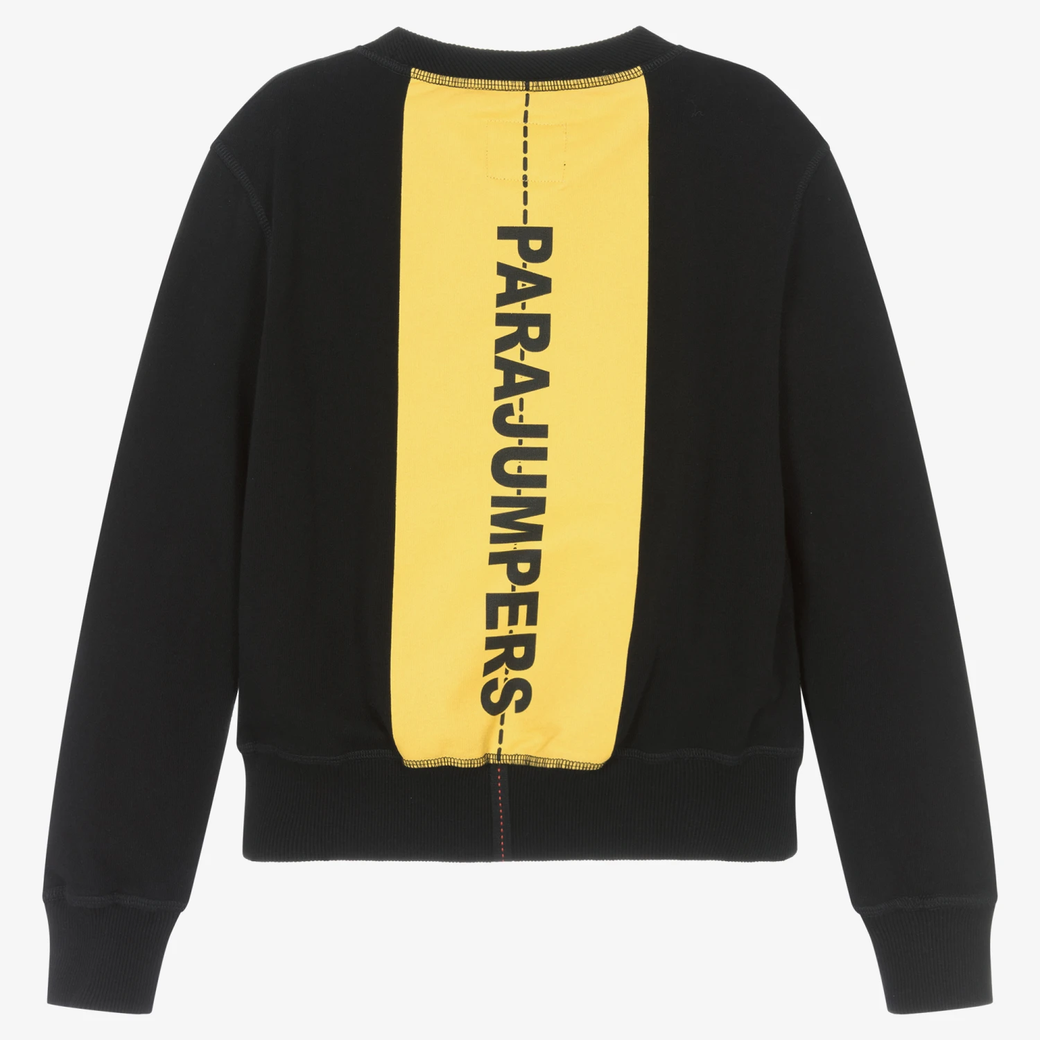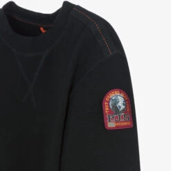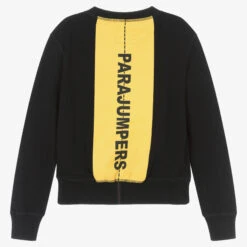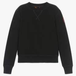 Contemporary black cotton sweatshirt for boys by Parajumpers, with a statement branded yellow stripe on the back. Made from soft, breathable jersey, this casual top has contrast orange stitching on the shoulders, and ribbed trims, for a cool and adventurous style. A branded logo patch on one sleeves adds an added designer touch.