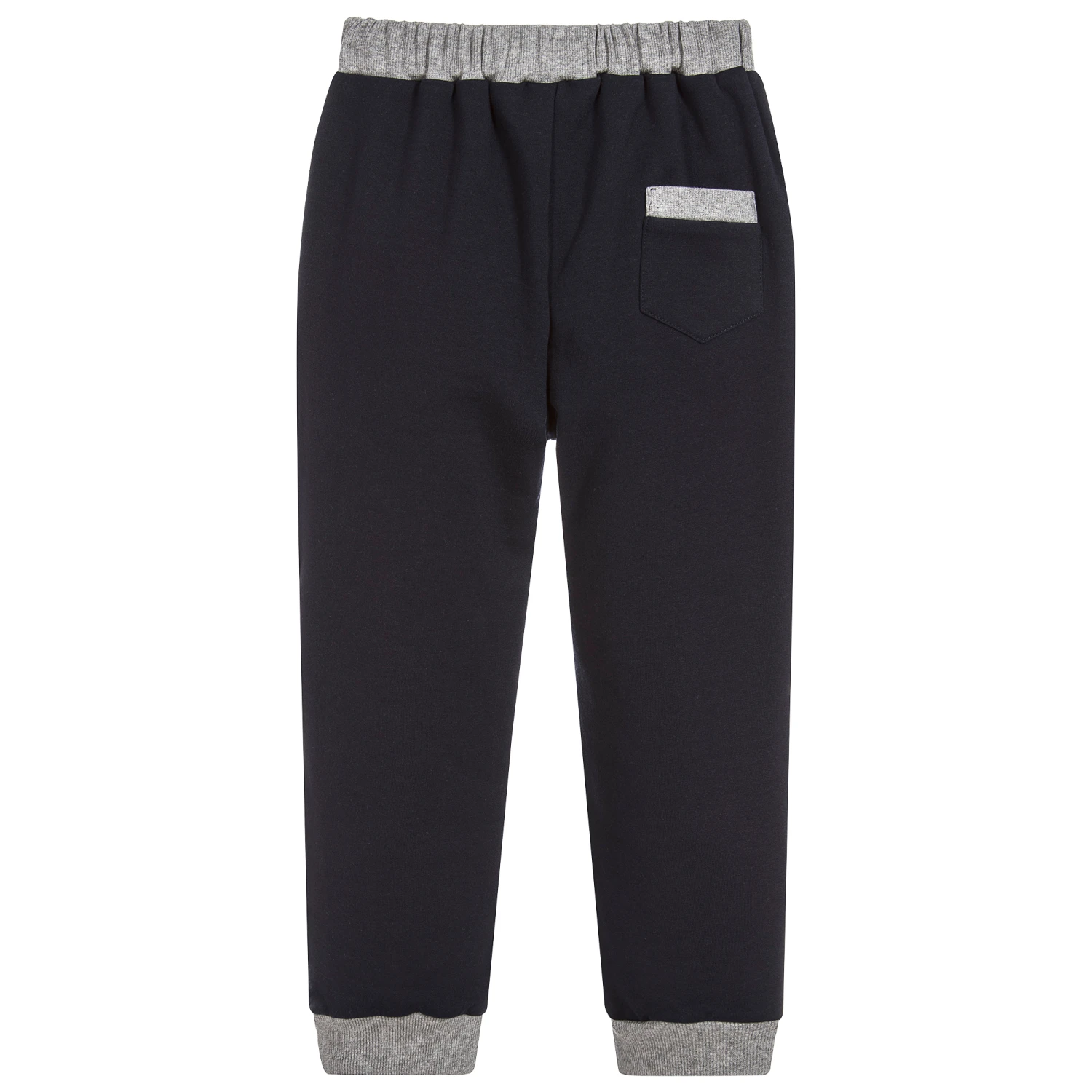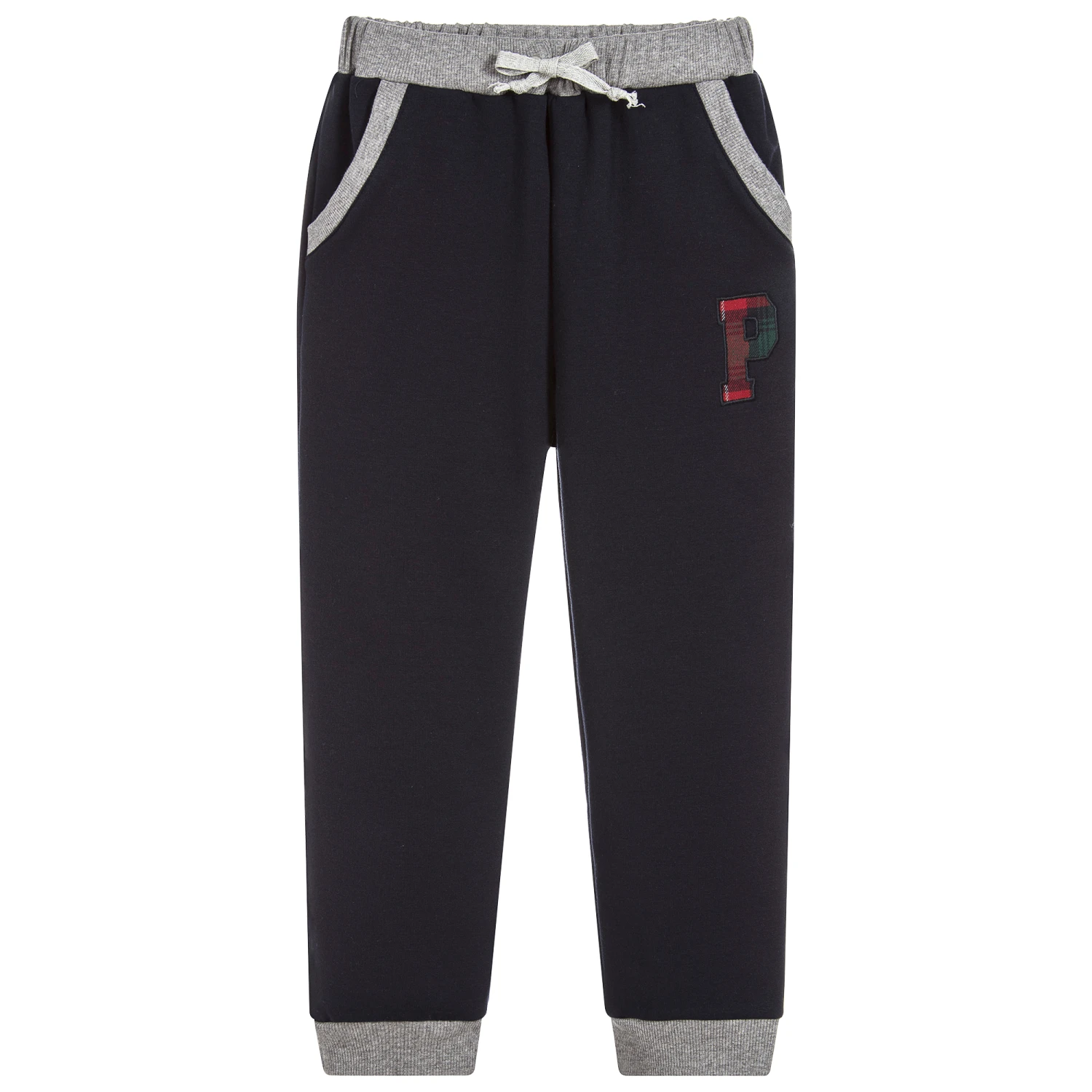 Boys navy blue joggers by Patachou, made in a comfortable, mid-weight cotton blend, with ribbed trims. They have a cosy fleece lining, pockets and a tartan logo appliqué.