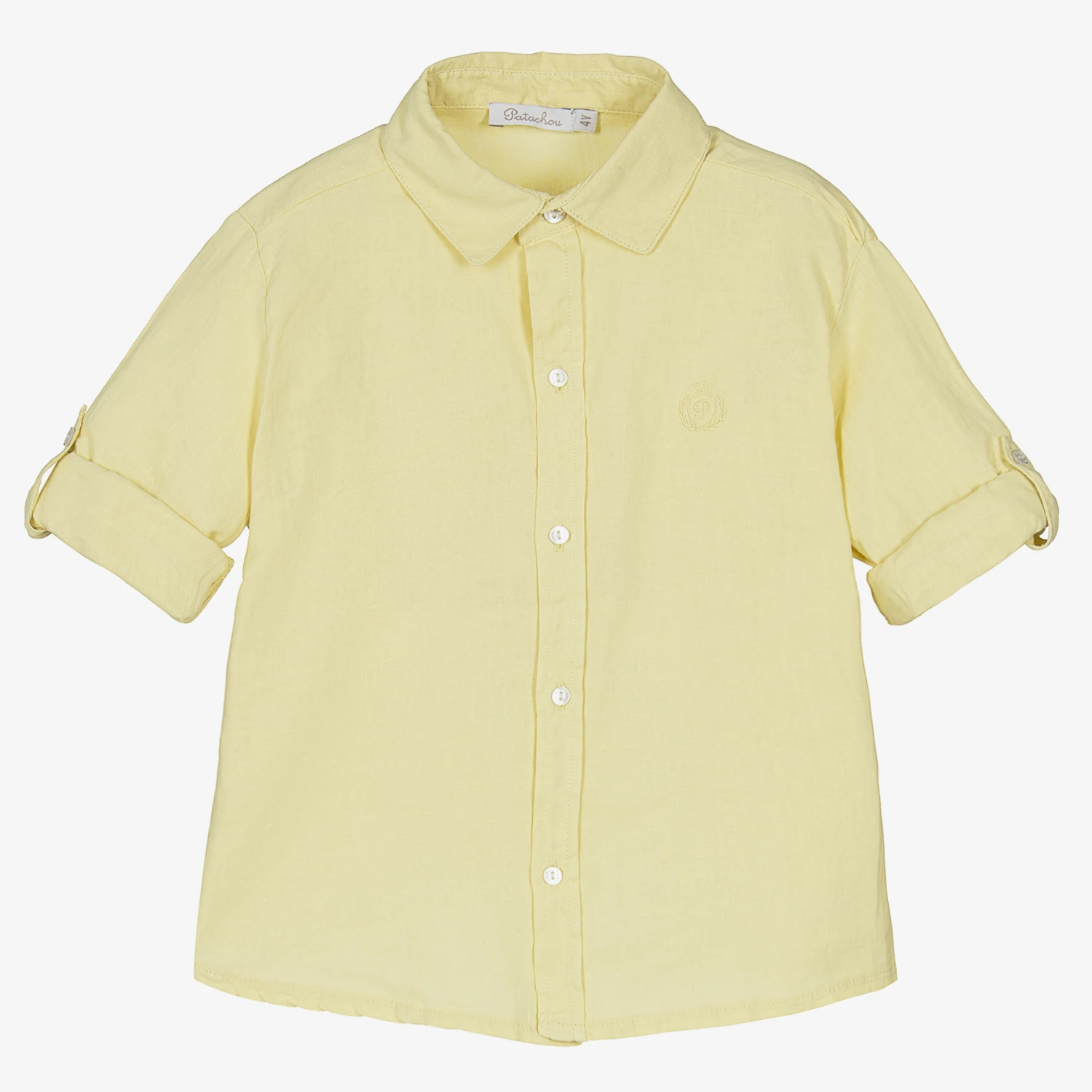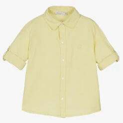 Boys classic yellow shirt from Patachou. Soft, breathable and lightweight, it is woven in cotton and linen for comfort in warm weather. This smart shirt has button tabs on the long sleeves, allowing the cuffs to be rolled up to keep cool. Subtle tone-on-tone branding is embroidered on the chest.