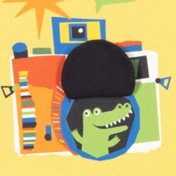 Little boys organic cotton T-shirt by Paul Smith Junior in bright yellow. The front has a fun camera Croc character appliqué and popper fastenings on one shoulder. The designer’s signature striped logo tag is stitched on the side seam.
