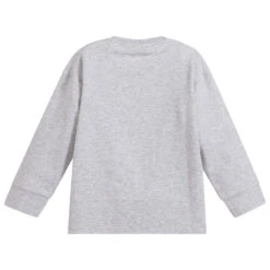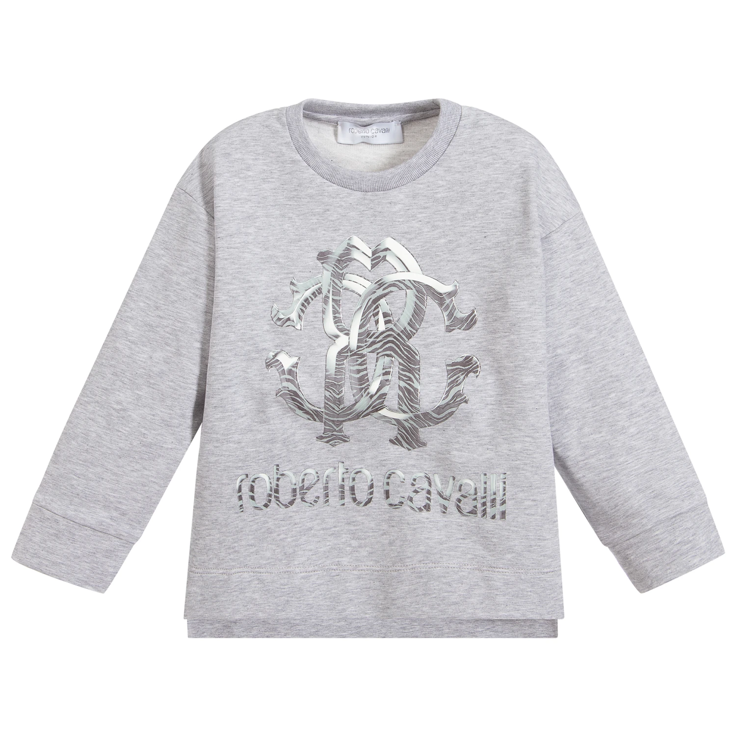 Grey marl cotton jersey sweatshirt for boys by Roberto Cavalli, with an ‘RC’ logo in a grey tiger stripe.