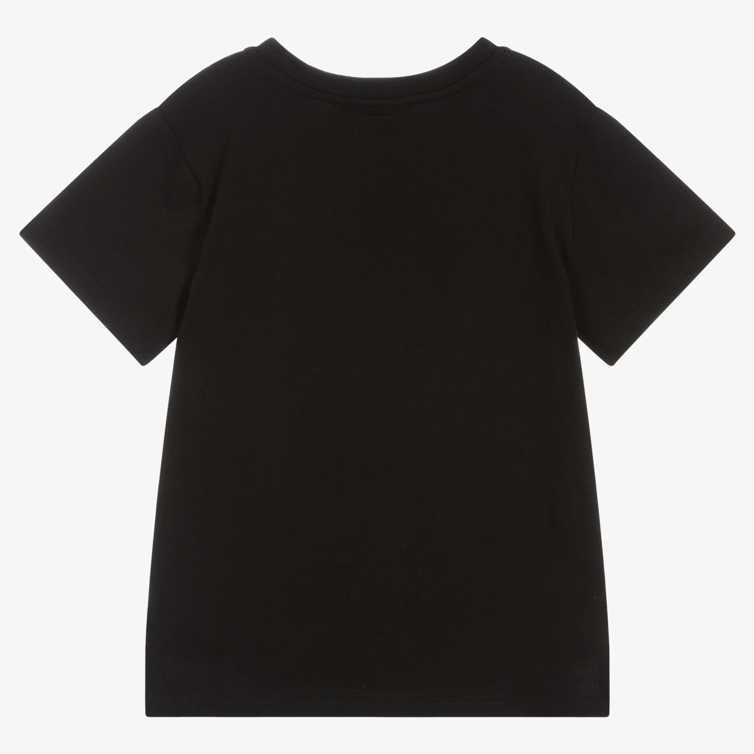 Black T-shirt for boys by Rock Your Baby, featuring a skating Godzilla graphic in blue and orange on the front. This cool top is made in soft and comfortable cotton jersey, with a ribbed crew neckline. A black branded tab near the hem adds a finishing designer touch.