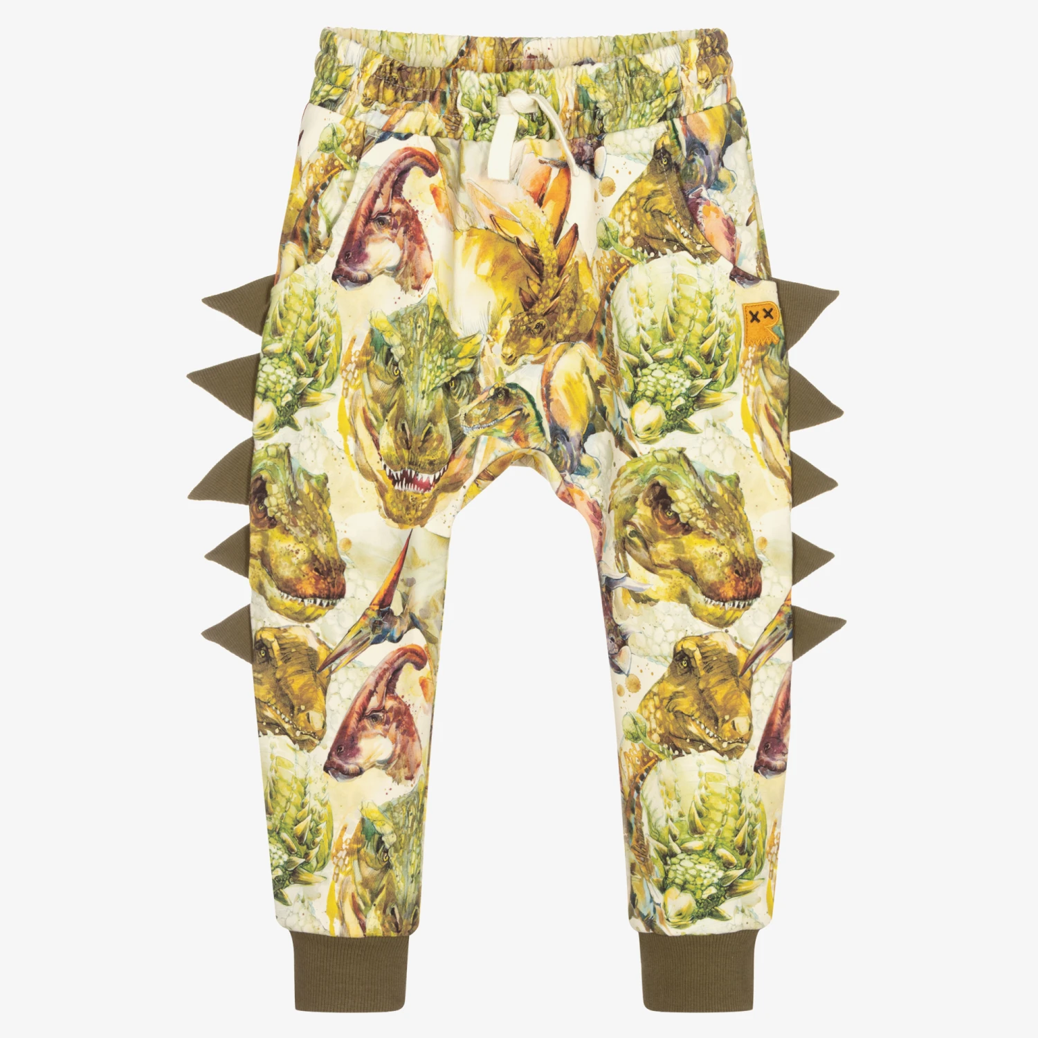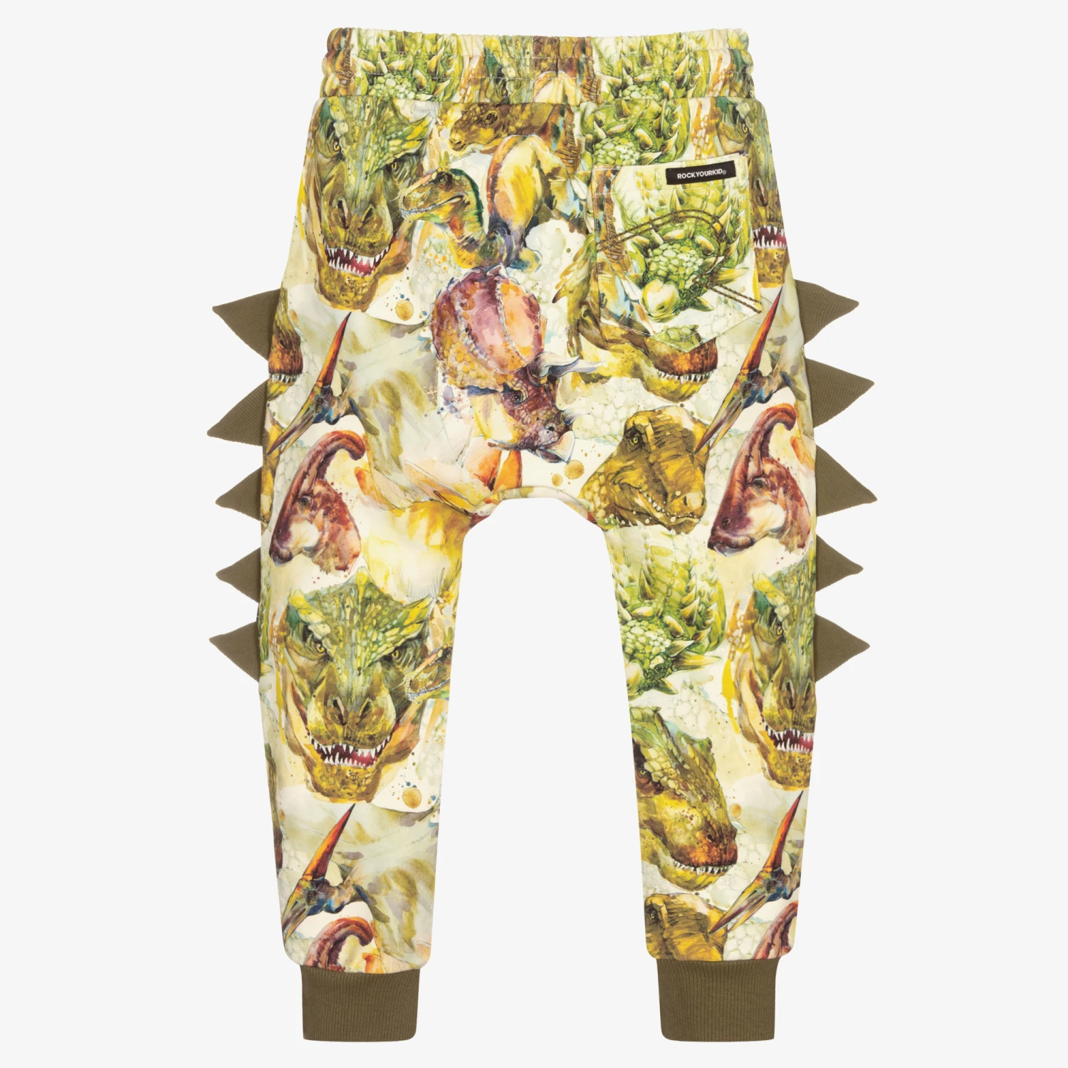 Boys green and ivory joggers from Rock Your Baby, made in mid-weight cotton jersey. They have a green ‘Triassic’ dinosaur pattern and green fabric fins on the sides. Soft and stretchy, they have a drawstring waistband and three pockets.