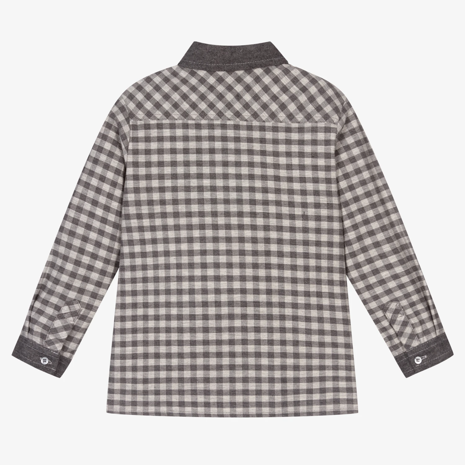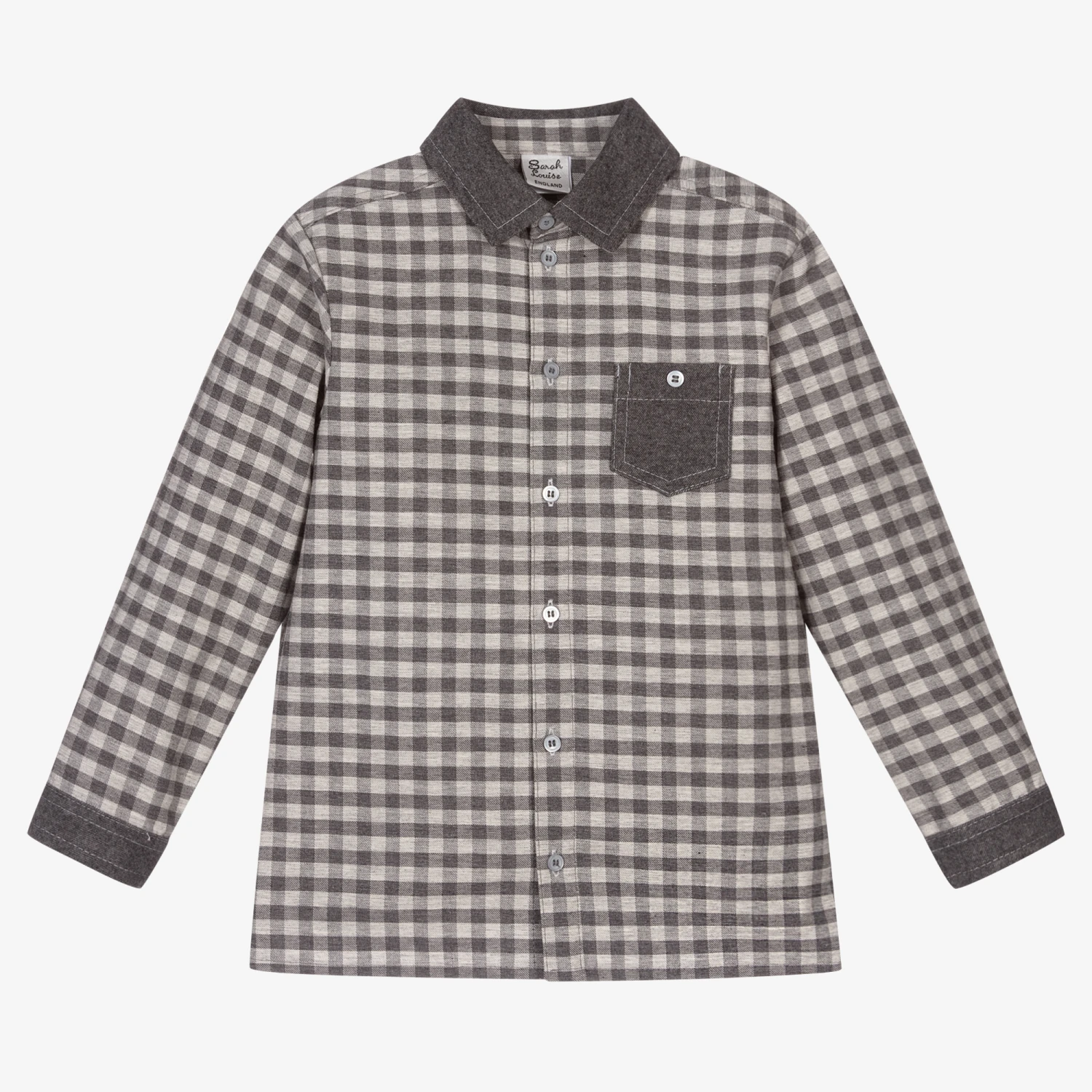 Grey checked shirt for boys by Sarah Louise, made in soft cotton twill. It has dark grey trims and button fastenings.