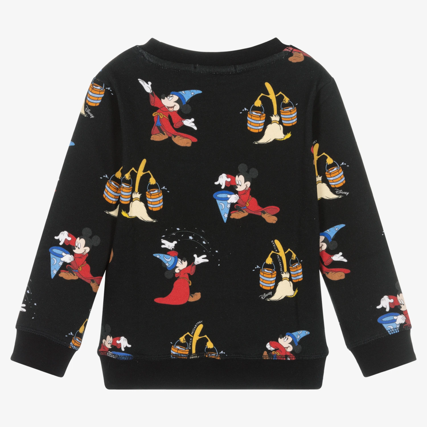 Black organic cotton sweatshirt for boys by Stella McCartney Kids. Forming part of the Disney© Fantasia capsule collection, this comfortable top is soft and fleecy inside and is patterned all over with iconic Mickey Mouse prints. For everyday comfort, it has a crew neckline and stretchy ribbed cuffs. The Stella McCartney fit can be quite small so choose a size up if you want room to grow.