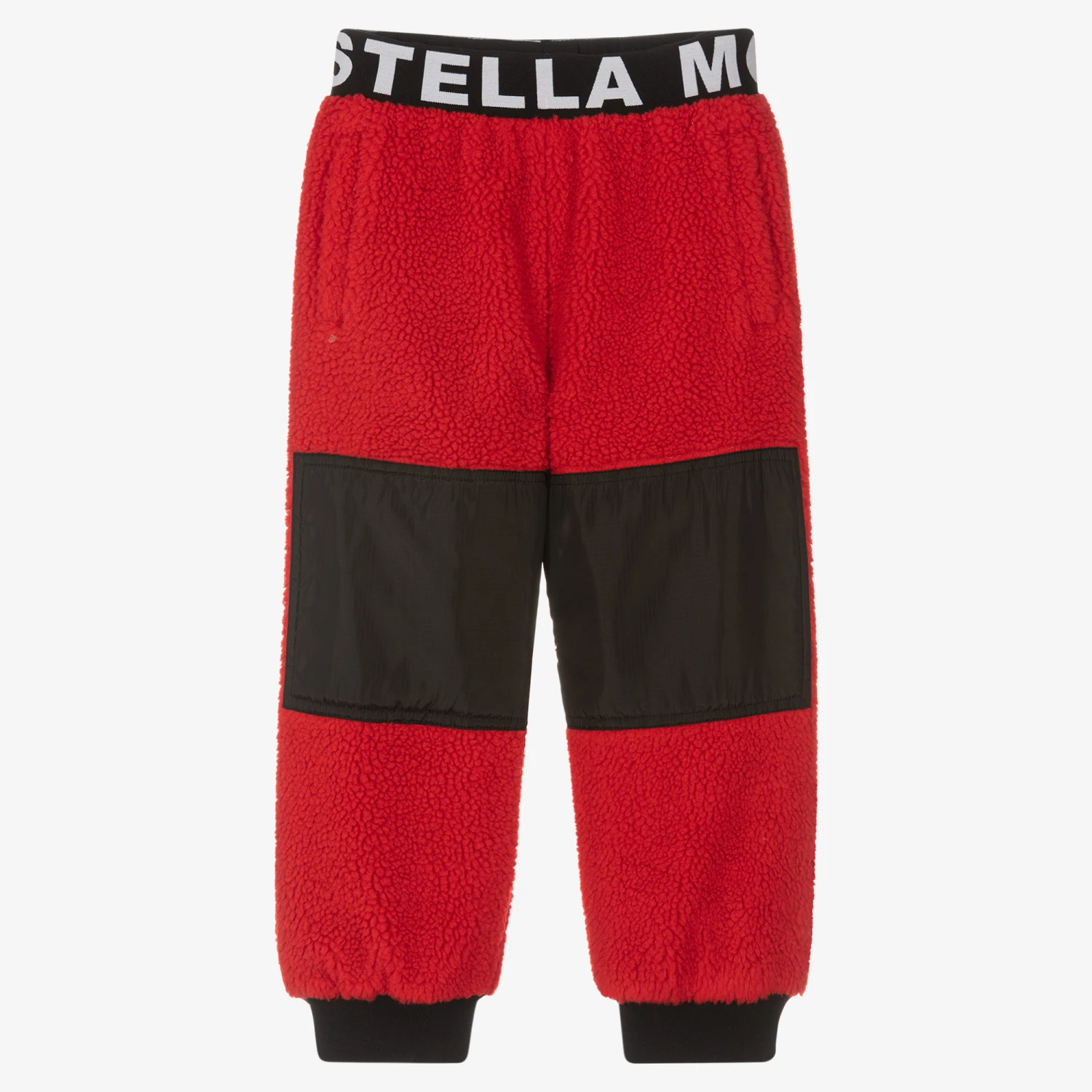 Red and black colourblock joggers for boys by Stella McCartney Kids, made in soft, recycled teddy fleece. A combination of sporty and casual, these relaxed fit joggers have an elasticated, padded waistband with a contrasting black and white intarsia logo. There are black nylon panels on the knees, gently ribbed cuffs, and useful front pockets.