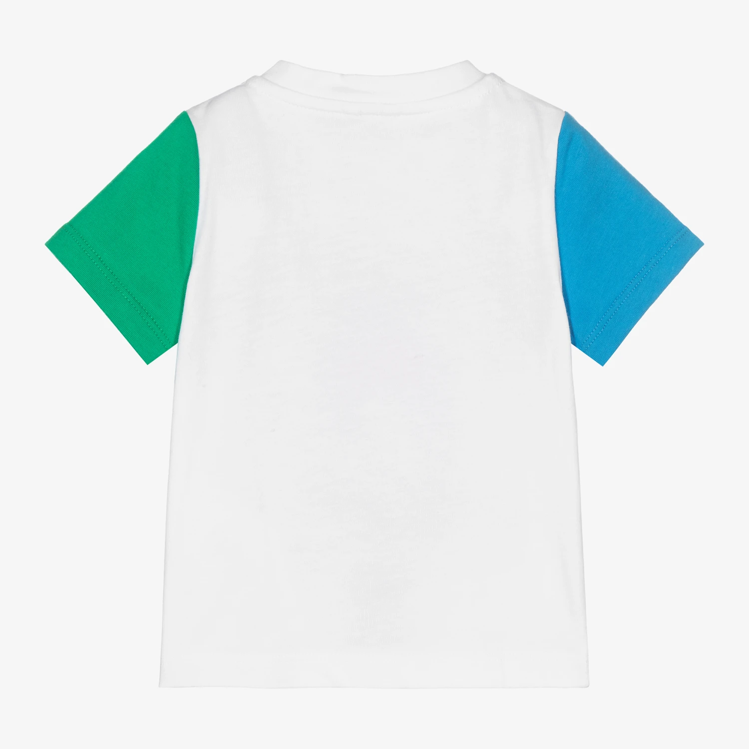 Little boys white organic cotton T-shirt by Stella McCartney Kids. Made with soft and stretchy jersey, there are green and blue short sleeves and a ‘Good Vibes’ graphic print on the front. It fastens with poppers on one shoulder for ease when dressing.