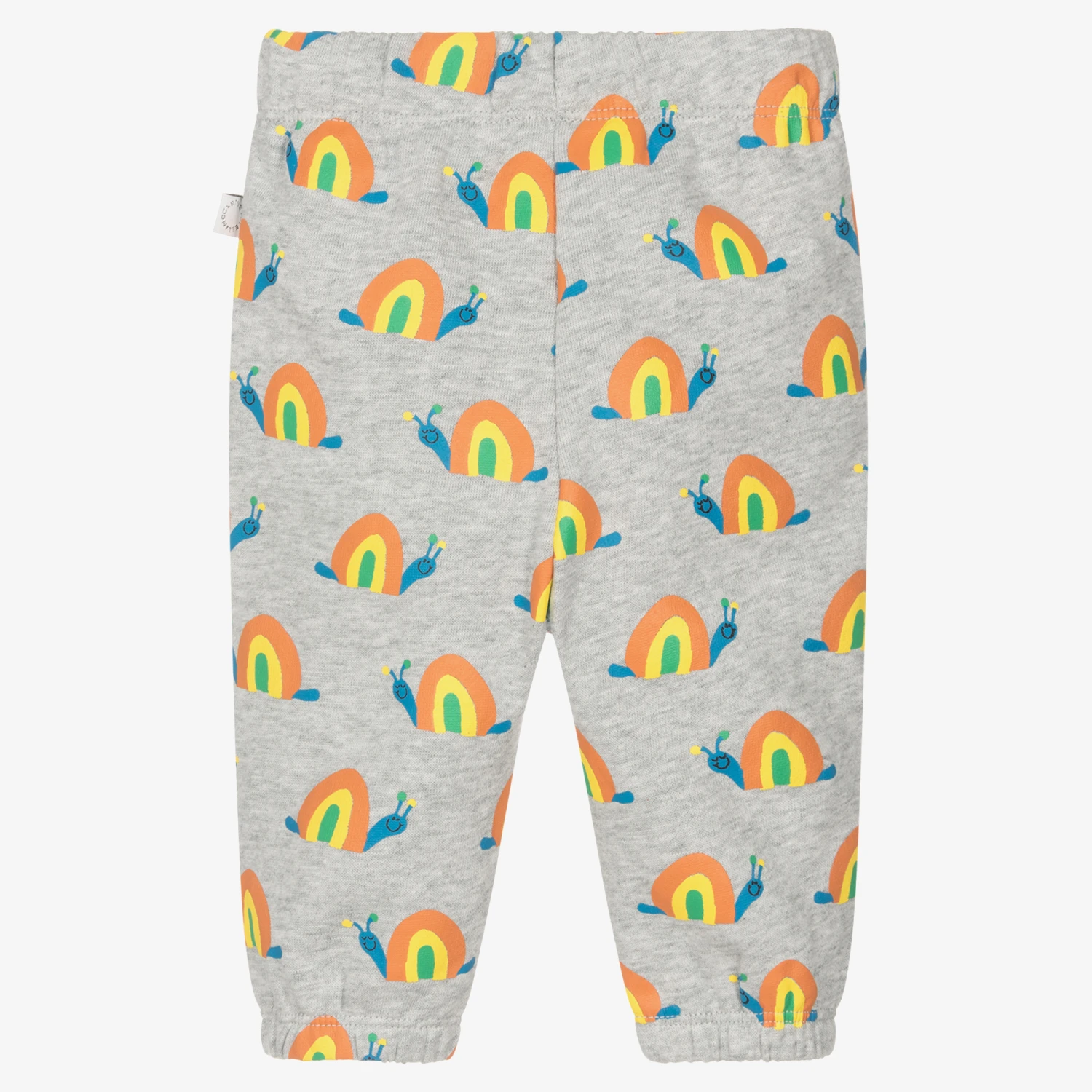 Grey marl cuffed joggers for little boys and girls by Stella McCartney Kids, patterned with a fun, colourful snail design. Ideal for relaxed days, they are made in a soft organic cotton with a fleecy underside. Gentle against little tummies, they have a gently elasticated waistband with a functional, blue drawstring tie for an adjustable fit. They have two front pockets and there is a small branded tab on the side seam for a subtle designer touch. The Stella McCartney fit can be quite small so choose a size up if you want room to grow.