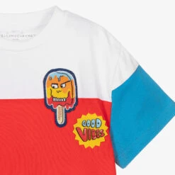 Boys white colour block T-shirt by Stella McCartney Kids. Made with soft, mid-weight organic cotton jersey, there are green and blue short sleeves and a red panel on the front with a fun ice cream stick and ‘Good Vibes’ appliqué.
