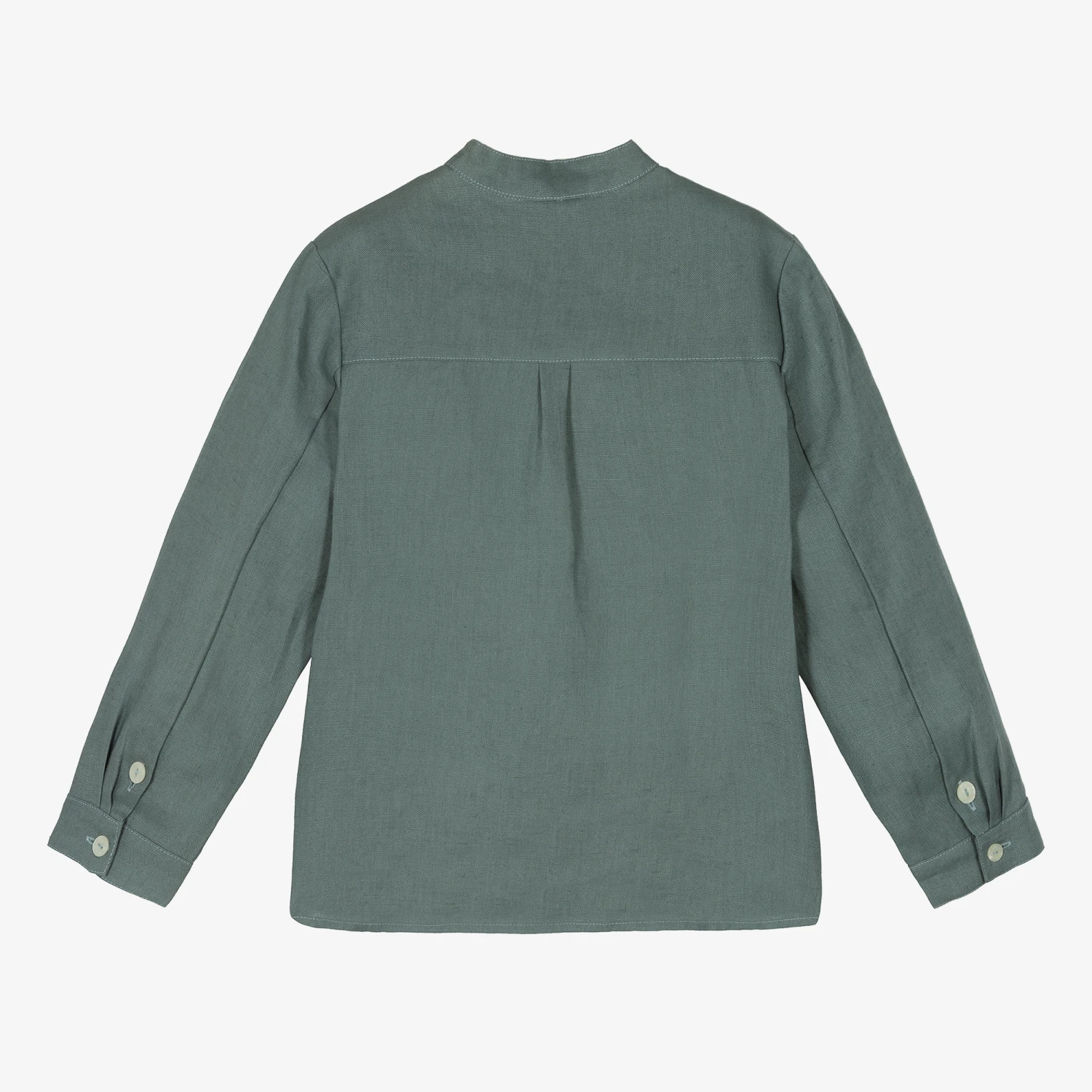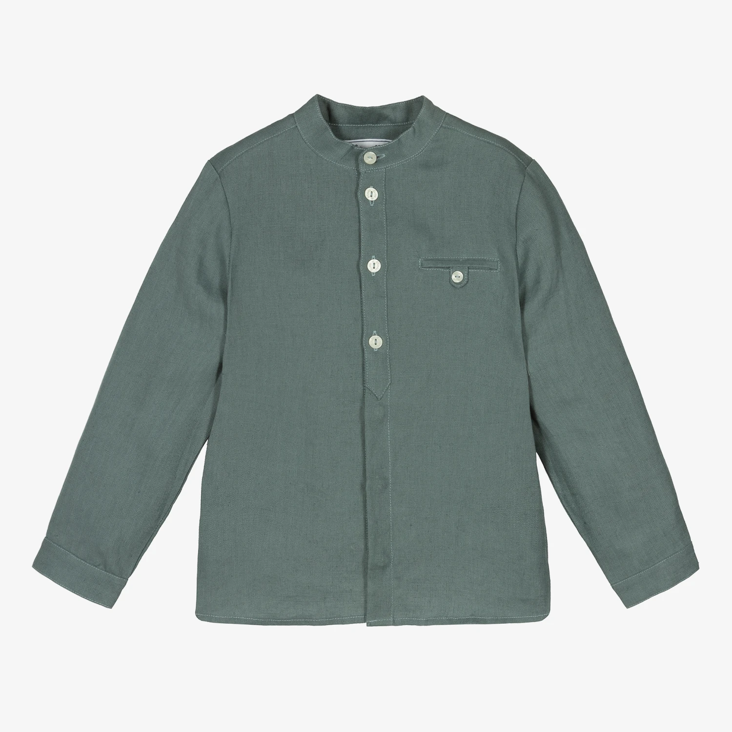 Grey-green collarless shirt for boys by Tartine et Chocolat. Cool and comfortable, this lightweight linen shirt has a faux chest pocket and branded button fastenings on the front.