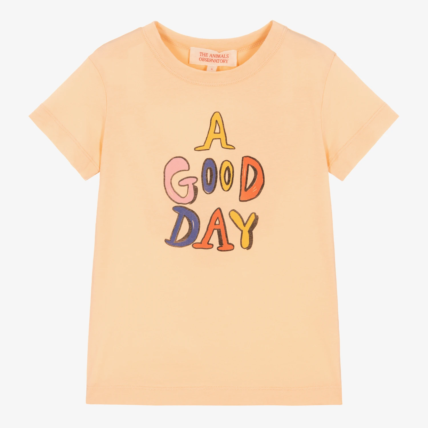 A pastel orange cotton jersey T-shirt for boys and girls, by The Animals Observatory. Spreading positive vibes, this casual tee has a colourful ‘A Good Day’ slogan, printed in a creative hand-drawn effect.