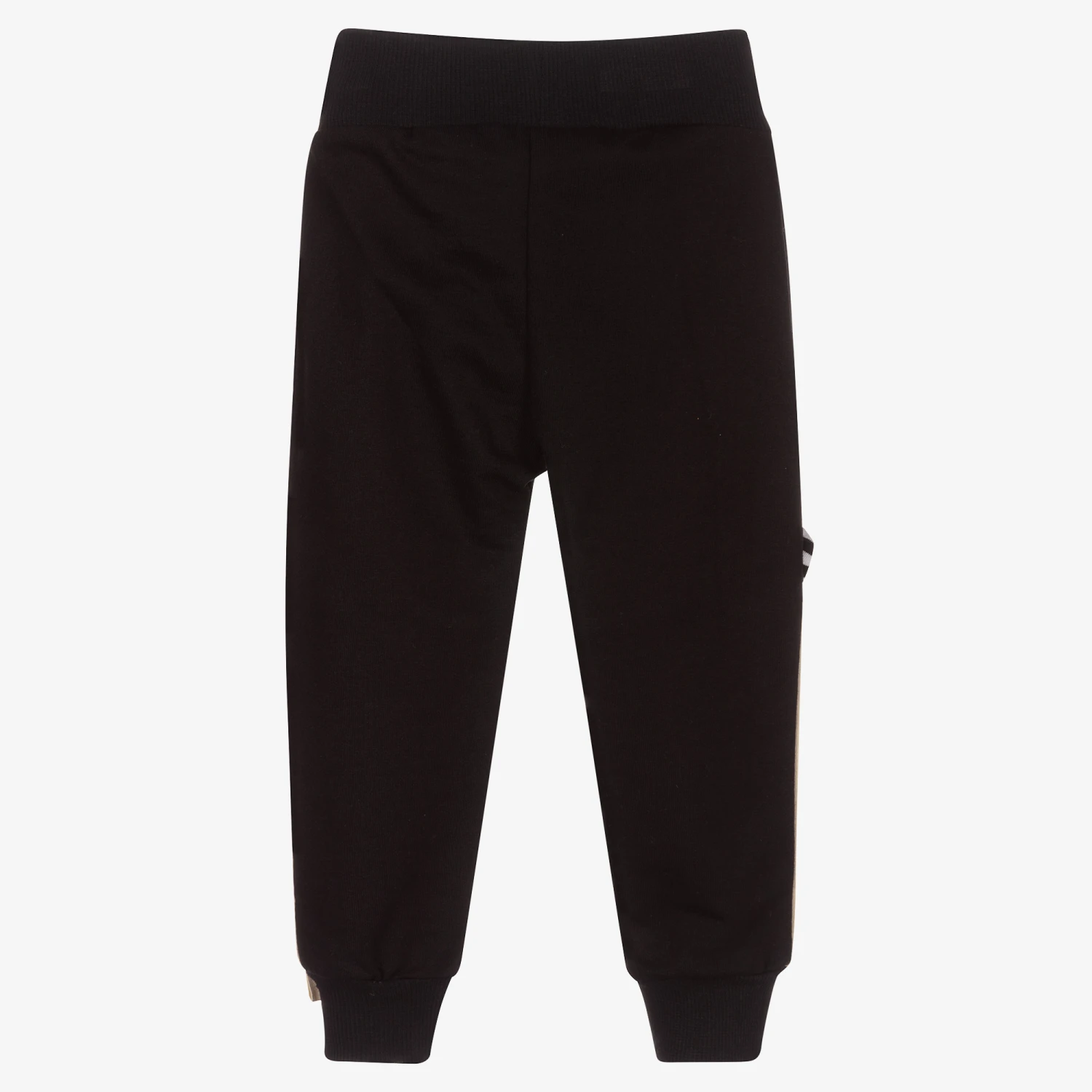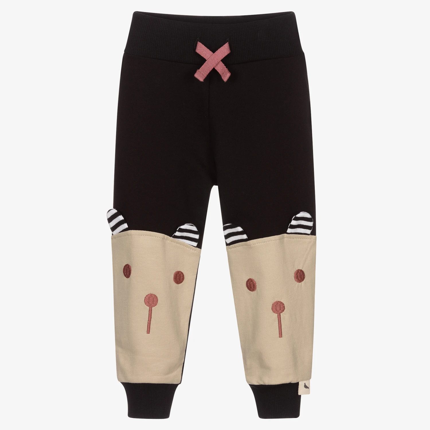 Black and beige joggers for little boys & girls by Turtledove London, made in mid-weight cotton jersey. They have sweet animal face embroidery on both legs, with striped appliqué ears. The elasticated waistband has a faux drawstring tie.