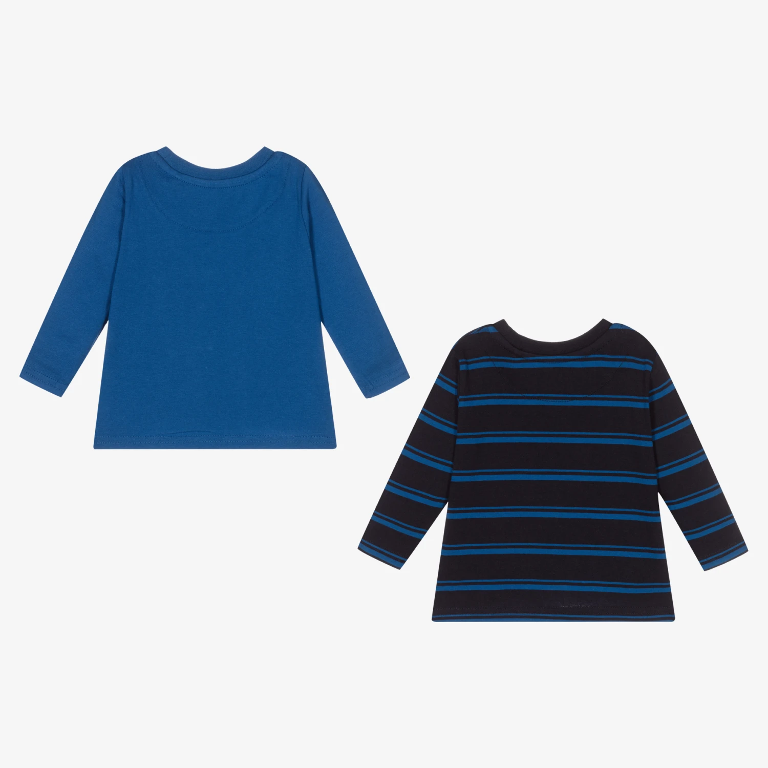 Pack of two tops for little boys by U.S. Polo Assn., made in soft cotton jersey. One top is solid blue, whilst the other is in a navy blue and mid-blue stripe. Both tops have the brand’s double horseman logo printed on the chest.