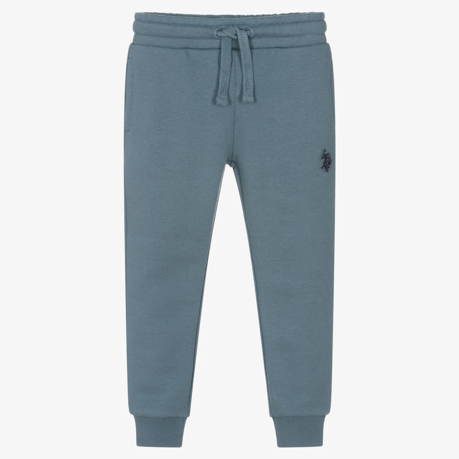 Soft blue joggers for boys by U.S. Polo Assn., made in comfortable mid-weight jersey with a cosy fleece feel inside. A casual cuffed style, they have a drawstring waist for an adjustable fit, and an embroidered double horseman logo on one leg. There are useful concealed side pockets and a patch pocket on the back.