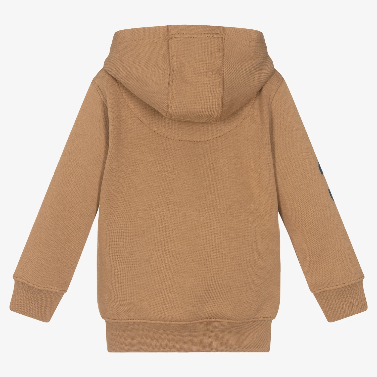 Casual brown hoodie for boys by U.S. Polo Assn., made in soft cotton blend jersey. The brand’s double horseman logo is embroidered on the chest, and there is a sporty ‘3’ logo appliqué on one sleeve.