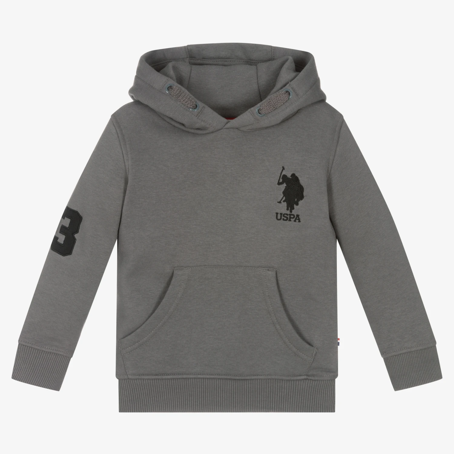 Grey hooded sweatshirt for boys by U.S. Polo Assn., made in soft mid-weight jersey with a cosy fleece underside. It is embroidered with the brand’s black double horseman logo on the chest and has the classic number 3 on one sleeve. To complete the look, there is a pouch pocket on the front and a faux drawstring detail on the hood.