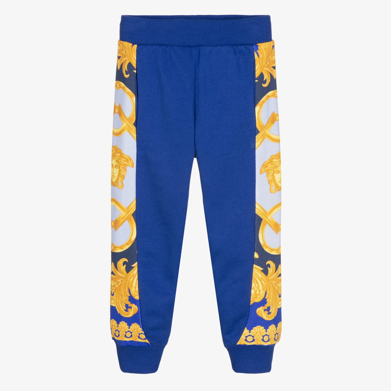 Boys bright blue luxury joggers by Versace, patterned with a gold Barocco 660 print down the sides of each leg. Made in mid-weight sweatshirt jersey, they have an elasticated ribbed waistband, front pockets and ribbed ankle cuffs.