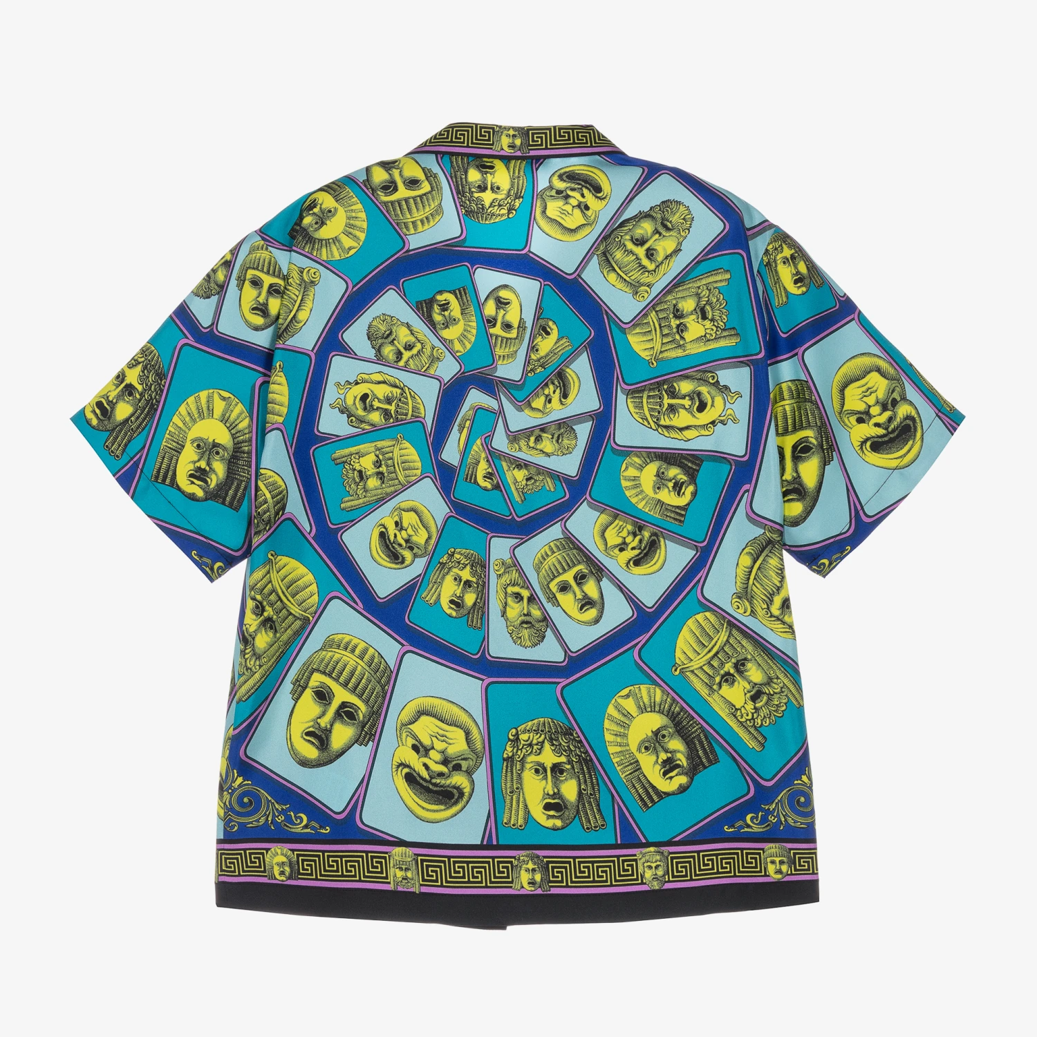 Stand-out Mini-me shirt for boys by Italian designer Versace, in shades of blue with black, yellow and purple detail. Made in luxuriously soft silk twill, it features the Le Maschere Kids print all over for a distinctive Versace vibe. A stylish revere collar and branded button fastenings complete the look.