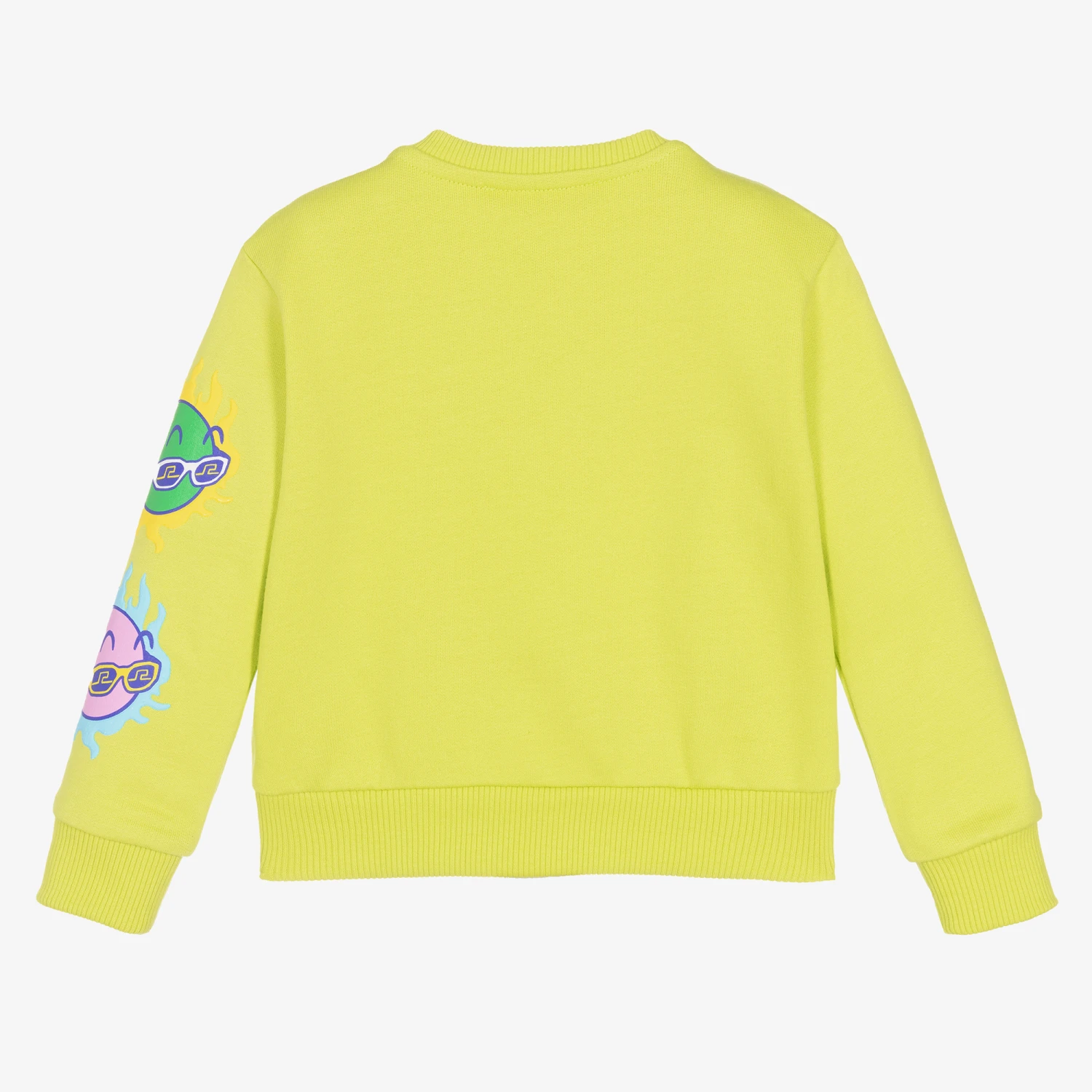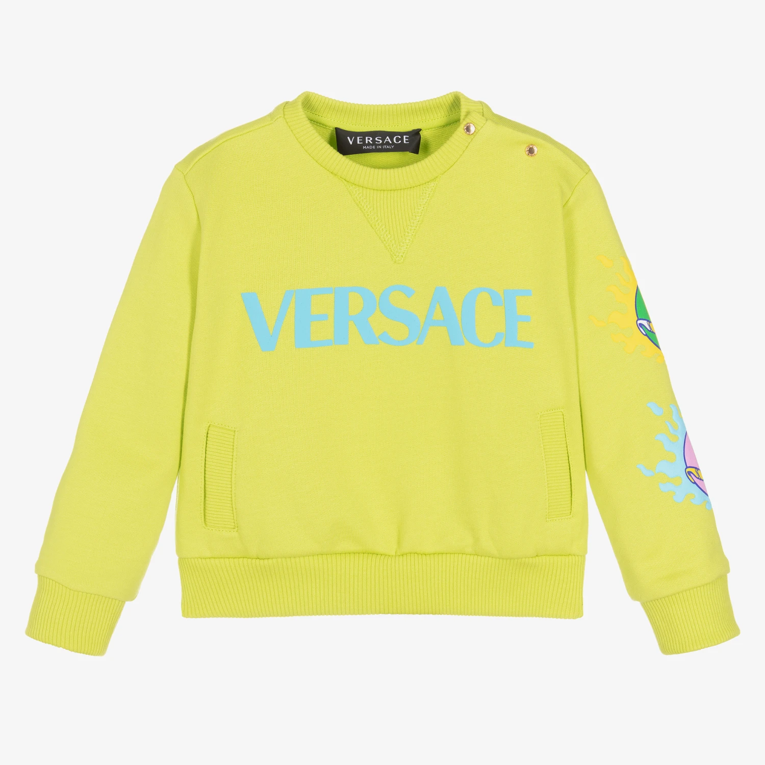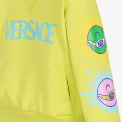 Boys green sweatshirt by Versace. Patterned with a seasonal Medusa Sunnies print down one sleeve, inspired by comic books, this mid-weight cotton jersey design has a sky blue logo print at the chest, and two front pockets.