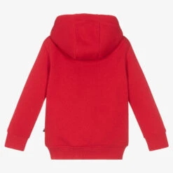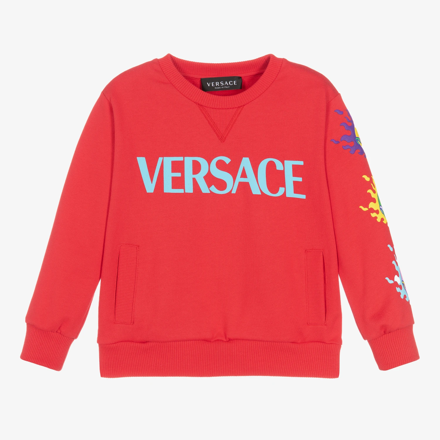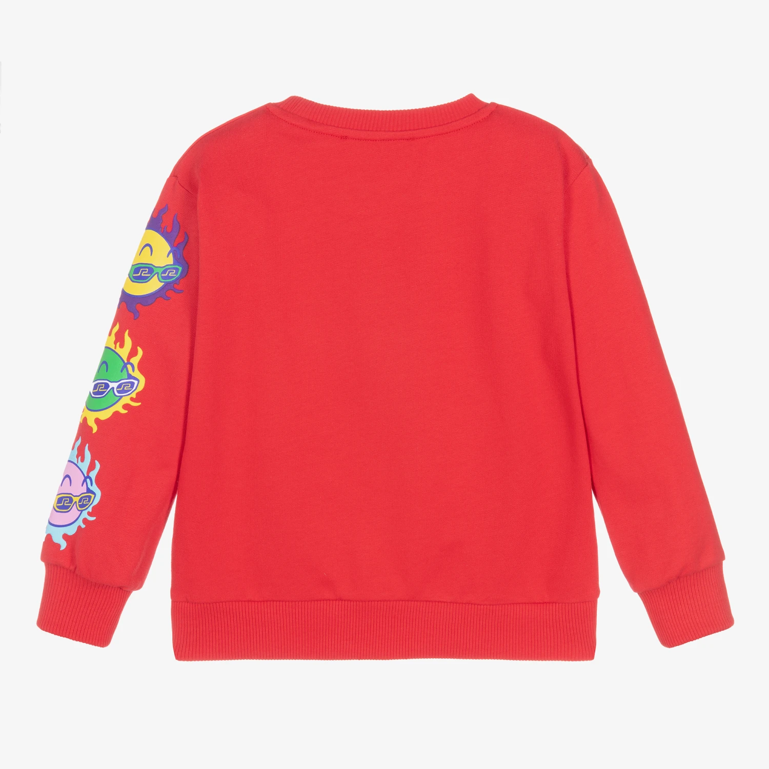 Boys bright red sweatshirt by Versace. Patterned with a seasonal Medusa Sunnies print down one sleeve, inspired by comic books, this mid-weight cotton jersey design has a sky blue logo print at the chest, and two front pockets.